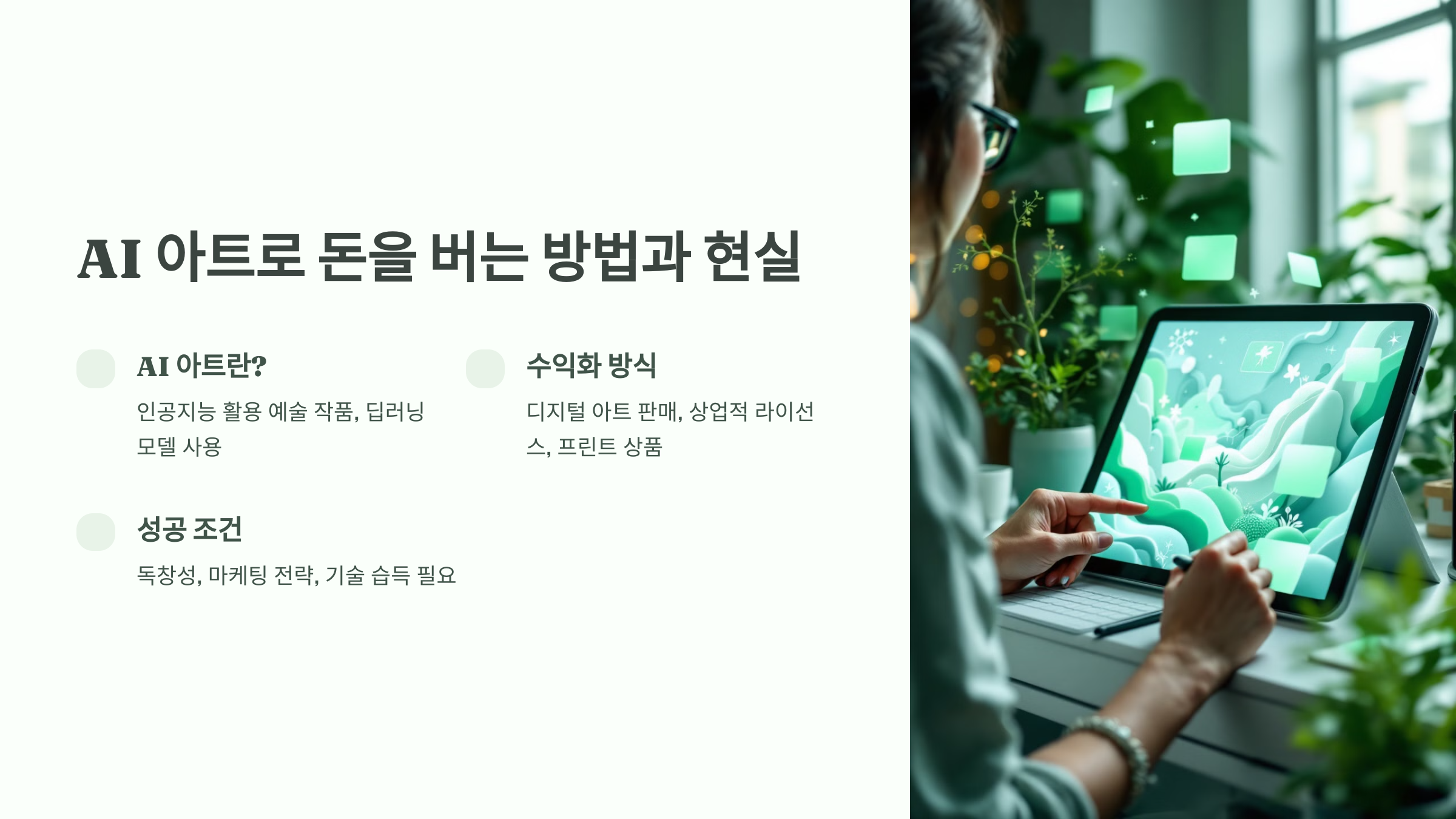 AI 아트로 돈을 벌 수 있는 방법은 생각보다 다양합니다. 아래 주요 사례들을 살펴볼까요? 👇
